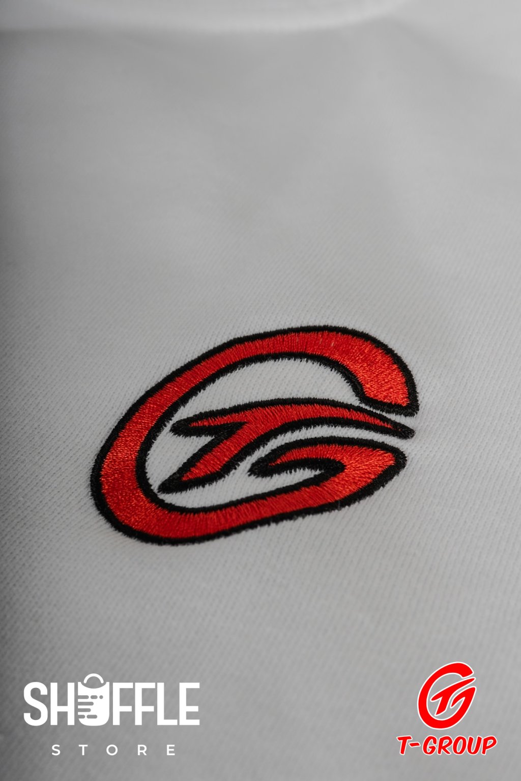 - Menší, červeně vyšité T-Group logo s černým obrysem na levé části hrudníku